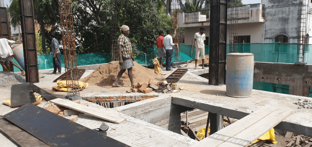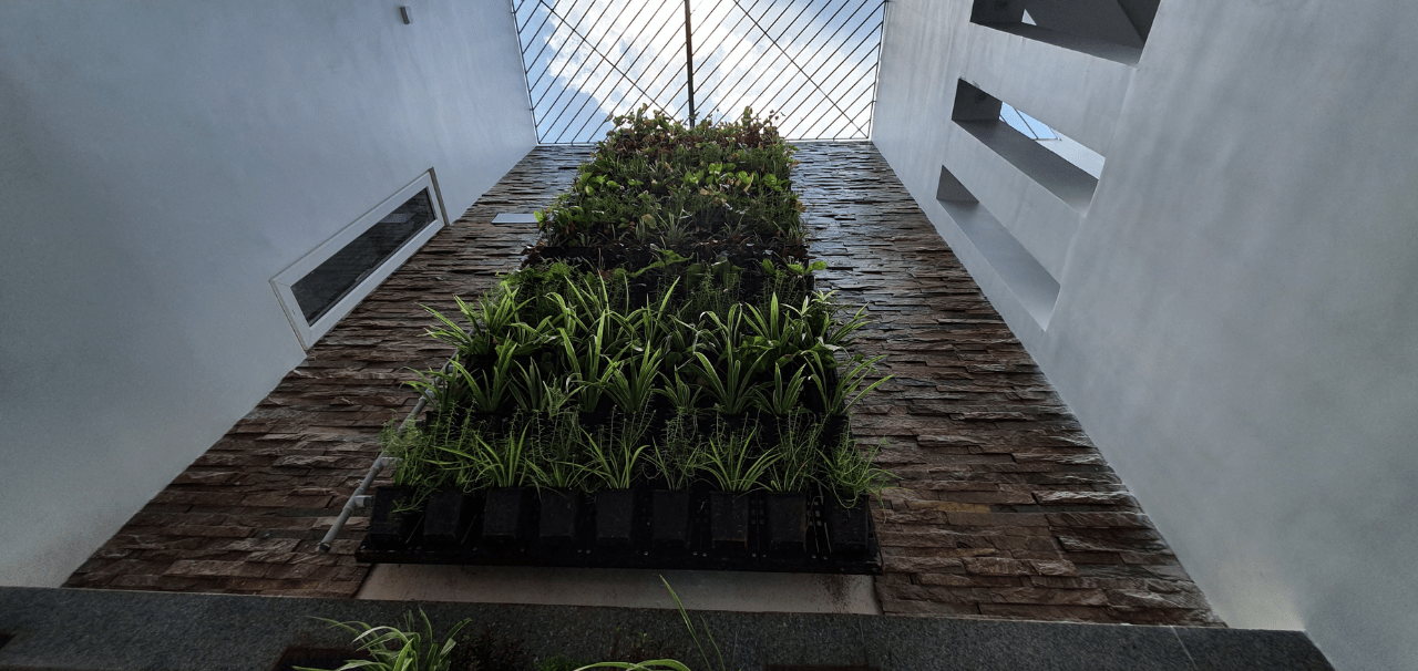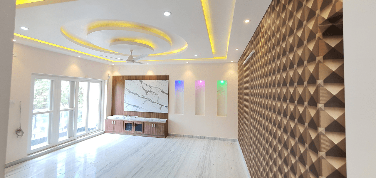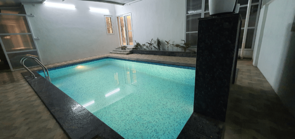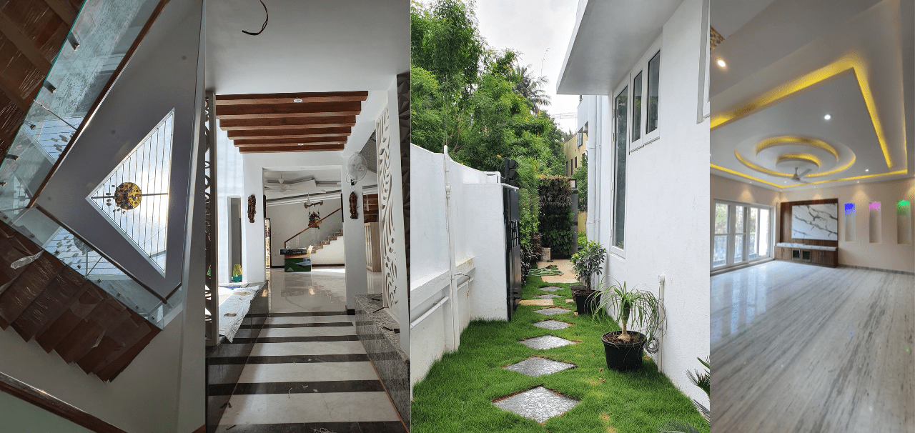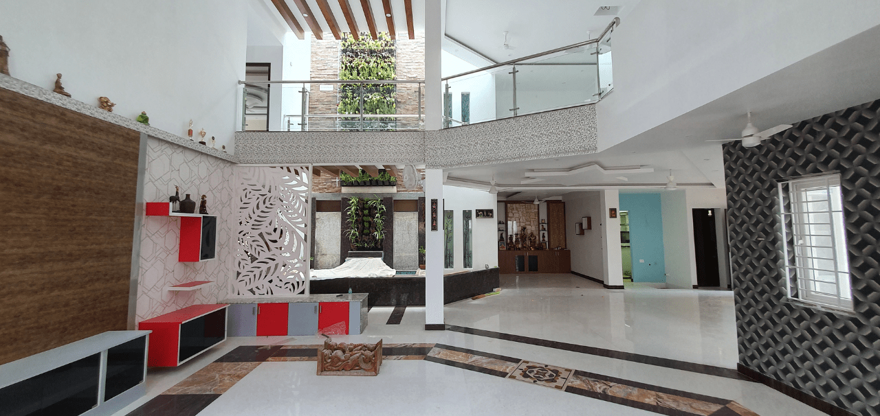 This residence at Ambattur was built in 2019 for Mr. Anandan comprising of the 5bhk green house building with views to swimming pool. Unlike other private houses in Chennai 5 miles away from an affluent suburb of the city. This house dominates its landscape like a classical villa. An opaque even forbidding entrance facade, dynamically asymmetrical but with symmetrical entrance gives way as one moves around the building to the open front. Maintaining a modern and elegant character both internally and externally, this 5 bedroom villa is planned in a manner where the semi-private areas like living and dining areas are clustered together while private areas,i.e,the bedrooms are kept in the first Floor. The dining area also opens into the Pooja area which reflects the order and peace framed within. The individual master bedroom suites, four in number have been given distinctly different aesthetics that echo the user’s individual personalities. Light is give a special consideration as well so that each of the spaces is well-lit receiving natural light. Connectivity of spaces, and open plan as well as privacy balanced in the design, which is layered in multiple levels and connected with external landscape spaces. Each Bedroom suite is complete with its own lounge, private study, walk-in-wardrobe and bathroom facilities. Planters and other design elements have been carefully chosen and placed to enhance the simplicity of the design, while adding character. Two stories up, a sheltering concrete canopy covers the dimensions of the perfectly square plan supported on concrete columns, floats over the wild composition below. Between the ground and the canopy is a double height interpenetrating outside and inside spaces lavishly accommodating the entire villa set up. The whole villa is 5400 sft. Which has a separate swimming pool and Terrace garden. There is a smooth metamorphosis from built to open spaces where functional spaces flowing to landscaped panoramas. A Koi pond and Vertical garden is incorporated within the design to add an element of tranquility and calm to the interiors. Every space of the house is designed in a way that it embodies warmth and comfort of a traditional home with modernity blending in.