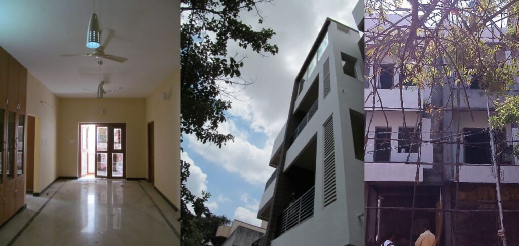This residential building at Anna Nagar was built in 2013 for Mrs Lima, comprising an area of 4600 sqft. An open plan was conceived with the idea of developing four individual 3BHK housing units. All the rooms opened directly into the dining room thereby eliminating any unnecessary circulating spaces. The orientation of the main entry and the position of the kitchen were determined by the basis of traditional Vaastu. All units have separate balconies for all bedrooms including Dining, which opens into the Front facade. There were similar space requirements for all the owners belonging to the same background and the community, gave rise to similar house plans. The units are interconnected through the central staircase areas. The upper floor overhangs parallel to the plotline providing shade to the entrance. All woodworks are done in teakwood with clear Matt polish.