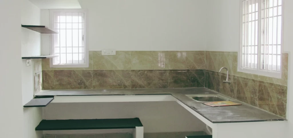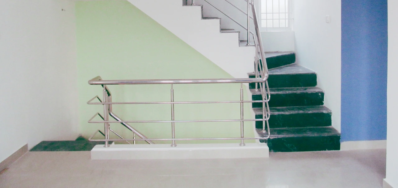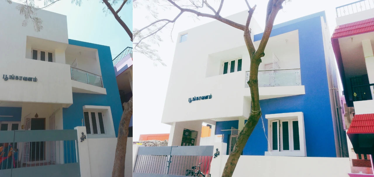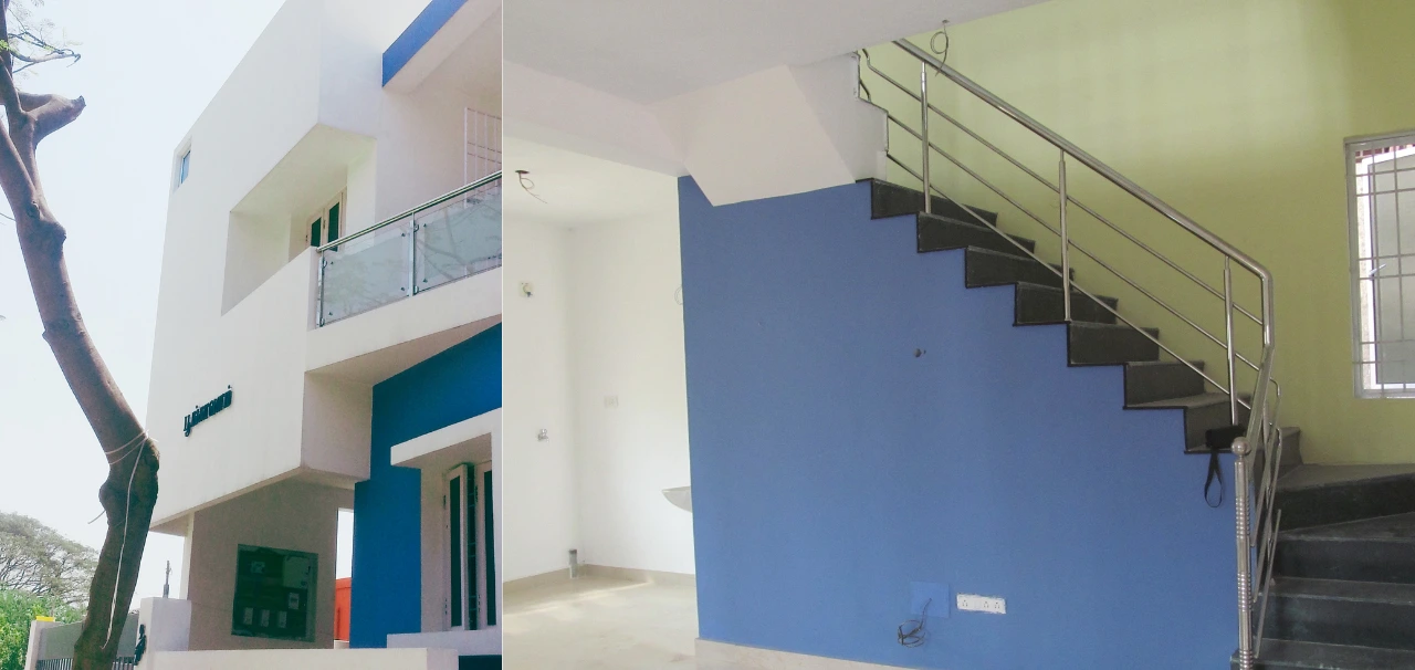 This residential building was built in 2014 for Mr. Karuna comprising an area of 2100 sqft. The client is a singer needed a calm and suttle space for his practice, which was separated from the rest of the house. It constitutes three bedrooms, double height dining area and a separate space for swing near the double height staircase. This building was designed and executed as per Vaastu. The spaces and openings have been optimally oriented to utilize the prevailing breeze which is essential in a warm humid climate. The three skylights, in addition, provide an almost a magical quality of light, can be opened to direct wind through the house. The building was defined in the purity of formal elements in space, is refined into a single cube, making areas of habitation by their surrounding relationships to each other and to the periphery of the volumetric space in which they sit. Between the kitchen and Bedroom lies the Family lounge with full-height windows opening to the backyard. The elevation is simple and minimal with bold and sharp lines.