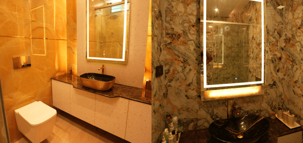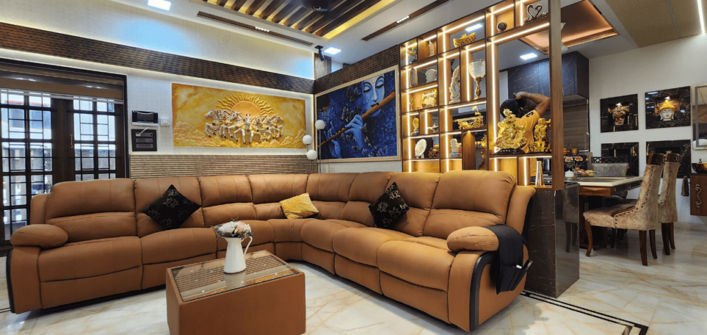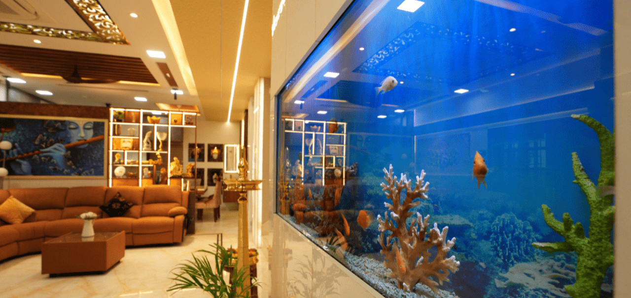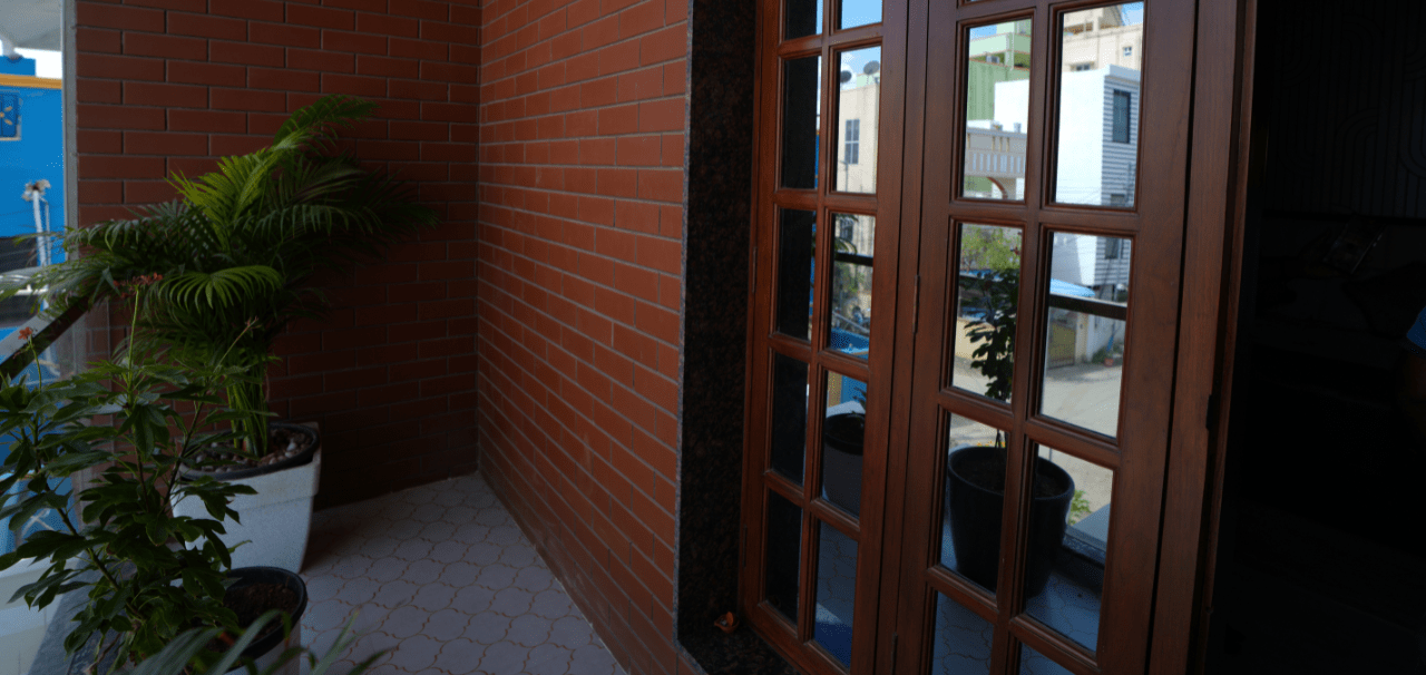 The house is built using sustainable, locally sourced materials, including Terracotta bricks and Teak wood, which honor Kerala’s traditional craftsmanship. The pooja room, carved from a single teakwood tree, is a standout feature, offering a serene, spiritual space. Imported marble flooring throughout adds a luxurious touch to the design.